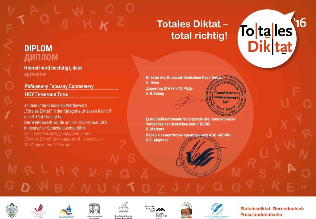 Добавим, в 2016 году с целью укрепления взаимодействия Российско-Немецких Домов, находящихся в Москве, Барнауле, Томске, Новосибирске и Калининграде, Самоорганизацией российских немцев было принято решение о проведении ряда сетевых проектов в этих регионах страны. Первым проектом среди них стала открытая всероссийская акция «Totales Diktat».
